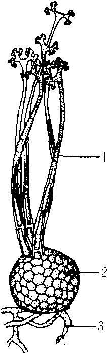 | 释义 | 叉丝单囊壳属Podosphaera子囊菌亚门,白粉菌目。菌丝体表生,存留或消失,吸器球形,伸入寄主表皮细胞内。闭囊壳球形或扁球形,暗褐色,附属丝生于壳顶或“赤道”带附近,刚直,全部或下部带暗褐色或淡褐色,顶端2~6次二叉状分枝;子囊单个,椭圆形或近圆形,壁单层,柄极短;子囊孢子8个,卵圆形至椭圆形,单胞,无色。无性态为粉孢属。常见的有白叉丝单囊壳〔P.leucotricha(Ell.et Ev.)Salm.〕,引致苹果属、梨属植物白粉病;三指叉丝单囊壳〔P. tridactyla(Wallr.) de Bary〕,引致李属植物白粉病。 叉丝单囊壳属 1.附属丝 2. 闭囊壳 3.菌丝 |