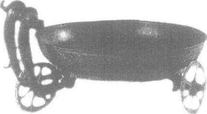 | 释义 | 双兽三轮盘春秋晚期制品,1957年在江苏省武进县淹城内城河中出土,现为中国历史博物馆收藏。此盘高15.8厘米,口径26厘米,整体如三轮车形,车身为圆盘,侈口,折沿,浅腹,矮圈足,腹外壁饰折线几何纹。盘底前置一轮,后有并行两轮,皆有六条辐。前轮两侧夹以双柱,自盘底伸出,折而向上,皆作兽形。兽独角上卷,吻部前突,面向盘内,似双双探视,颇具神韵。兽体下部凸出一细足,微卷,与兽角相呼应。兽通身饰线刻纹,颈饰鳞纹,下接双翅纹。此盘构思奇妙,结构新颖,三轮可转动,既具有三足的稳定感,又灵活,使用方便; 双兽形柱不仅起到把手的作用,而且使造型富于动感,具有独特的装饰效果。 双普三轮盘 此器为目前所知唯一的仿车形结构的青铜器皿,是春秋晚期吴国青铜器中的杰作,反映了吴人的聪明才智和浪漫情怀。 双兽三轮盘1958年江苏省武进县湖塘淹城出土。春秋时期青铜器。通高15.8厘米,盘口径26厘米。折沿无耳,浅圈足。一侧圈足伸出两柱,折而向上,柱端作有冠兽首,折处夹一轮;另有两轮与此轮成三角形,可自由推行。腹部饰几何纹,轮柱兽身饰鳞纹和三角弦纹。此器设计奇巧,形制独特,迄今未见同类之例;铸制工艺精细,形态优美,反映了吴国铸造工艺的非凡成就和吴人浪漫的生活情趣。极为珍贵。 |