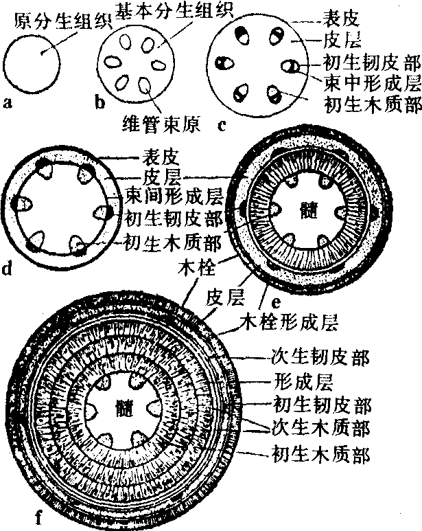 | 释义 | 双子叶植物茎shuangziyezhiwujing双子叶植物的茎。除具初生结构外,还有次生结构。茎的初生结构是由顶端分生组织通过细胞分裂,产生许多新细胞,其中在顶部的细胞仍旧保持顶端分生组织的特性,能够继续进行细胞分裂。在基部的细胞经过生长,渐渐分化为3种组织系统: 保护系统 (表皮)、基本系统 (皮层、髓部)和维管系统。由顶端分生组织产生新的细胞或组织的过程,叫做初生生长; 由各种初生组织组成的结构,叫做初生结构。表皮在茎的外面,具保护作用,属保护组织。一般由一层细胞所组成,细胞形状较规则,排列紧密;一般不含叶绿体,外壁较厚,角质化并有角质层;表皮上具气孔,是气体出入的通道。皮层是多层细胞构成,主要是薄壁细胞,常为球形、椭圆形,壁薄,由纤维素和果胶质组成,具细胞间隙。有的植物细胞间隙发达,构成通气系统。靠近外方的薄壁细胞常具叶绿体,故使幼茎呈绿色。无色的薄壁组织具贮藏作用。茎的皮层还常具厚角组织,有的还具纤维或石细胞。一般植物茎无内皮层,只有沉水植物的茎或一些地下茎,有凯氏带加厚。维管系统是由分开的维管束和束间的薄壁组织构成,称为维管柱 (亦称中柱); 但在有些植物中,维管柱可以成为差不多是连续的。维管束由初生韧皮部、形成层、初生木质部组成。在茎的中心是髓,一般由薄壁组织构成,具细胞间隙。双子叶茎的次生结构是维管形成层活动的结果。由维管形成层形成的次生韧皮部和次生木质部,以及由木栓形成层形成的周皮,称为次生结构。由次生结构的增加,使茎加粗,称为次生生长。维管形成层的来源有两个:一是由初生韧皮部和初生木质部之间保留下的分生组织,它在维管束内,称为束中形成层;另一是髓射线里面与束中形成层部位相当的薄壁细胞,又具有分生能力,形成束间形成层。束中形成层与束间形成层连接在一起成圆筒状,在横切面上为一个圆环。维管形成层的活动,主要进行细胞的切向分裂,向内形成木质部细胞 (次生木质部),加添在原有木质部(初生木质部)的外方;向外形成韧皮部(次生韧皮部),加添在原有韧皮部 (初生韧皮部) 的内方。维管形成层在不断形成次生结构的同时,也进行径向分裂或横分裂,增加原始细胞,扩大维管形成层的圆周,以适应茎的不断加粗(图3)。有些草本双子叶植物的茎,仅有束中形成层,而不具束间形成层,次生结构比较少。还有少数草本双子叶植物,不仅没有束间形成层,连束中形成层也很不明显,次生结构更少,甚至完全没有(如毛茛)。维管形成层的活动,使维管组织不断扩大,其外围的表皮或皮层细胞恢复分裂能力而形成木栓形成层,产生新的保护组织——周皮(由木栓形成层、木栓层和栓内层组成)。木栓层形成后,木栓外方的组织,由于断绝水分和养料而死亡。(参见 “木栓层”条)。