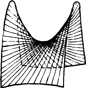双曲抛物面(a,b>0)是直纹曲面,它可由直线族λ(x/a+y/b)=z,x/a-y/b=2λ,或μ(x/a-y/b)=z,x/a+y/b=2μ来产生,这里λ,μ是参数,这两族直线分别叫做双曲抛物面的λ族母线和μ族母线,经过双曲抛物面上的任一点有且仅有每一族中的一条母线,这两族母线无公共直线,同族的两条母线必不共面,不同族的两条母线必相交,同族的一切母线平行于同一个平面. 双曲抛物面有且仅有两族母线,其上的直线不属于λ族即属于μ族,见图.