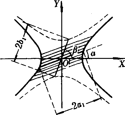 =1的两共轭直径的斜率分别为k和k′,则kk′=b2/a2(证明参见“椭圆的共轭直径”).设两共轭直径的长分别是2a1和2b1,两直径和实轴所夹锐角分别是α和β(α<β)(如图),则a1b1sin(β-a)=ab,a12-b12=a2-b2。 |