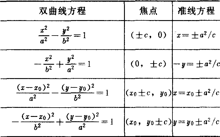❷设c>a>0,到定点F1 (-c,0)(或F2 (c,0))的距离r1(或r2)和到定直线l1:x=-a2/c(或l2:x=a2/c)的距离d1(或d2)之比等于c/a的点P必在双曲线 上.依据这两个性质,可将双曲线定义为:到一个定点的距离和到一条定直线的距离之比等于一个大于1的常数的点的轨迹,这个定点叫做双曲线的(一个)焦点.这条定直线叫做双曲线的(一条)准线,这个大于1的常数叫做双曲线的离心率. 双曲线方程和焦点坐标、准线方程的对应关系如下表所示.