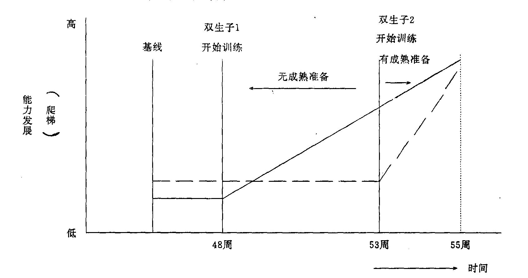 | 释义 | 双生子经典实验shuangshengzi jingdian shiyan美国心理学家A.L.格塞尔早年提出他的核心理论成熟势力说,认为儿童心理发展是一个由内部机制控制的过程,教育等外因不能影响其基本方面。在生理结构成熟之前,训练意义不大,环境对于发展只是提供适当时机而已,影响很有限。他的成熟势力说的理论依据就是双生子实验。他让一对同卵双生子分别接受爬梯训练,双生子1从第48周开始接受训练,双生子2从第53周开始接受训练。发现双生子2只用了两周的时间就达到和双生子1同样的水平,实验如图所示:
