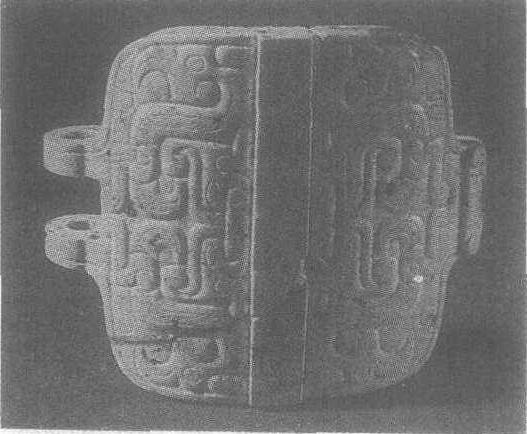 | 释义 | 双系拱形起脊玉饰春秋晚期。高5.65厘米,宽8.2厘米。1986年江苏省吴县春秋吴国玉器窖藏出土。玉料为牙白色,器身作拱形瓦状,四角圆,正面中央有一凸起直脊。直脊两侧各饰一组浅浮雕凤鸟、兽面复合纹饰。兽面作弯眉,椭圆形眼,阔嘴,兽面的两端各延伸出一只凤鸟。凤鸟为高肉冠,钩形喙,圆眼,身体饰细刻画纹。直脊两侧的纹饰相对称。器反面有四组蟠虺纹、鸟纹。器两侧有系,一侧系琢成兽头形;另一侧为相互平行的圆圈双系。器物由整块玉料琢成,造形十分奇特,纹饰亦极为精美,是这批窖藏玉器中的精品。