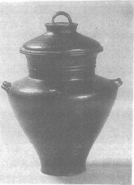| 释义 | 双系黑陶罍铜石并用时代龙山文化。高21.6厘米,口径15厘米。1974年山东省胶县三里河出土。北京中国历史博物馆藏。陶罍是一种盛酒器或盛水器,大汶口文化时期即已出现,到商周时期多为青铜罍。此件陶罍用细泥轮制法做成。口沿外撇,颈部有内收弧度,肩较宽,上配对称的双耳、双鼻。腹下部急促内敛,颈、肩、腹分饰凸凹弦纹几组。盖为覆碗形,顶端有一半环纽。制作规整,造型端庄秀美。器外部精细磨光,黝黑闪亮,是龙山文化中十分精美的黑陶制品。龙山文化见“黑陶鼎”条目。