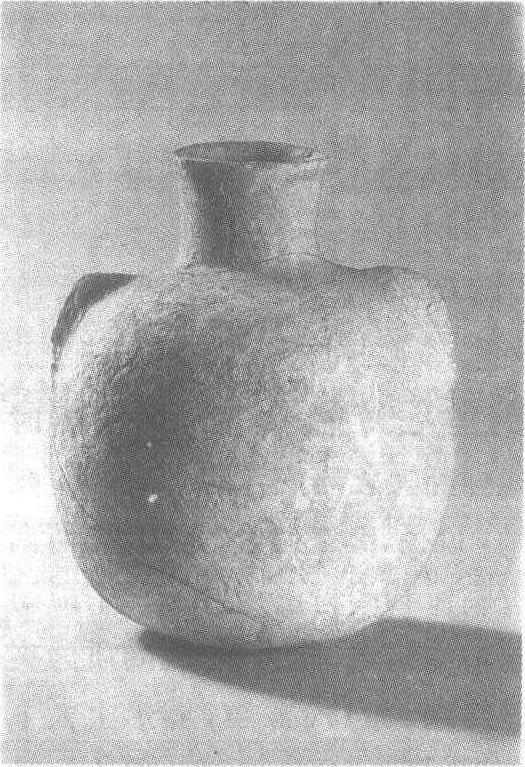 新石器时代裴李岗文化。高19.6厘米,口径6.1厘米。1977年河南省新郑县裴李岗出土。北京中国历史博物馆藏。此壶用淘洗后的细泥为料,手工制成。胎体较薄,色泽橙黄,壶体呈球形,侈口,细颈,肩部的对称双耳为弯月形。陶壶造型朴实、简洁,无纹饰,具有较多的原始性,是裴李岗文化陶器的典型作品。