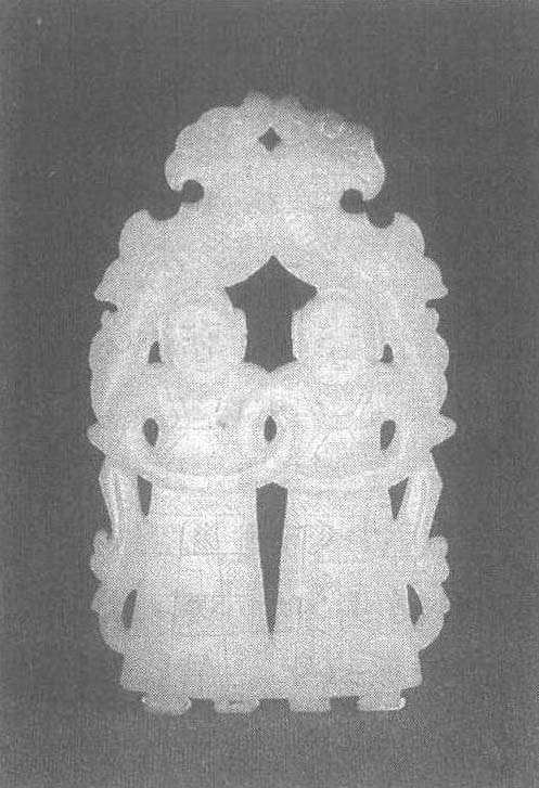 | 释义 | 双联人形玉佩汉。高5.7厘米,宽3.4厘米。天津市艺术博物馆藏。白玉雕刻,采用镂空和线刻并用的手法雕出两个玉人,为形象相同的两男。眉眼、嘴均以“一”字形阴刻线表示,脸庞较圆,双耳大,身穿窄袖长袍。两玉人的长袍的纹饰略有差异,分别为方格和菱格形图案。两人的手臂相套连,形成连环状。头顶琢有双鸟,头朝外相背而立。鸟首呈凤头形,身硕尾长,尾蜿蜒伸至双人的下体构成玉佩的边缘。此玉佩琢制精细,构图巧妙,堪称汉代的优秀饰品。
