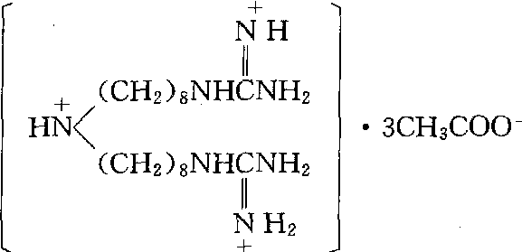 | 释义 | 双胍辛胺guazatine有机氨杀菌剂。化学名称:双(8-胍基辛基)胺醋酸盐。化学结构式如下。原药为白色粉末,溶点143.0~144.2℃,溶解度(g/L),水764,甲醇777,乙醇117。广谱性杀菌剂,对多种病原真菌的生长具抑制作用,其作用机制是抑制菌体类脂合成,在植物上具较强的局部渗透性能。主要用于果树休眠期喷洒或涂抹树干或枝条防治苹果腐烂病,葡萄黑痘病,对生长期的苹果斑点落叶病,芦笋茎枯病亦可喷洒防治,另用药液浸渍柑橘果实防治青、绿霉病,拌小麦种子防治网腥黑穗病亦有效。对人畜中等毒性。大鼠急性口服LD50300~326 mg/kg,急性经皮LD50>1 500 mg/kg,对皮肤和眼睛有微刺激。对鱼及水生生物低毒。