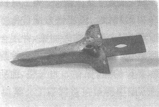 战国。古代兵器。长26.5厘米。1980年四川省新都县战国墓出土。四川省博物馆藏。此铜戈宽援,援上有一圆形孔。有上下胡,胡上下各有一穿。直内,内中心处有一菱形孔。胡的一侧有一族徽。