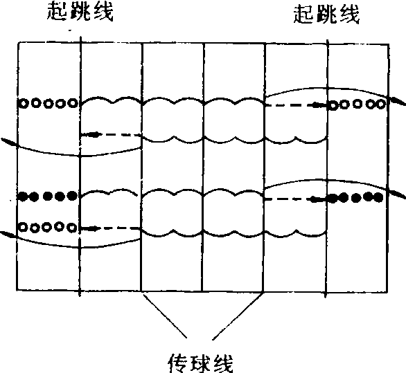 器材 排球2个。 场地 在排球场两边限制线与端线之间各画一条长9米的线为起跳线, 两边限制线为传球线。 游戏方法 将参加游戏的学生分成人数相等的甲乙两队,每队平均分为两组在排球场两侧相对站立。教师发出口令后, 比赛开始两队的第一名学生将球夹在两膝中间,用双脚跳向前行进,到达对面的传球线时停住,将球传给对面的同学,然后跑到对方队尾,对面排头接球后用同样方式返回,直至全队完成,以先完成的队为胜。 游戏规则 ❶行进间如果球落地, 应持球到原落地地点将球夹好继续比赛。 ❷接球学生接住球后应在起跳线后, 将球夹好再前进。 |