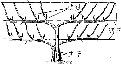 | 释义 | 双臂水平形整形twoarm horizontal cordons training篱架葡萄常用的一种整枝形式。分单层双臂和双层双臂等树形,以后者应用较广。双层双臂水平形整形时,植株常具主干1~2个,由每个主干上再分生出两个主蔓,诱引到左右侧铁丝上作水平绑缚,分上下两层,俗称臂。枝组配置于各主蔓上,相距20~25 cm,每年作规则式修剪。本形整形技术简便,枝梢和果穗在架面上分布均匀,便于管理,结果部位相对稳定,树势易均衡。