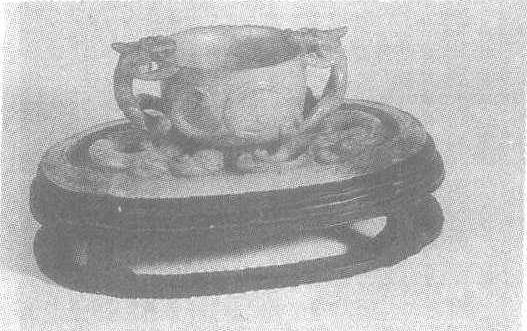 | 释义 | 双螭玉杯清早期。通高5.5厘米,口径6.7厘米。北京故宫博物院藏。青玉制作,口沿微撇,深腹,圈足,镂雕双螭耳。螭头上有独角,四肢粗壮,呈攀沿状。圆杯下附托盘,盘呈海棠式,中心有突起为杯座。盘内浮雕双螭,并饰水涡纹,刀法粗犷。杯与盘均有紫红色浸痕。乾隆时期此物配置了木盒,盖面上有御制题记,文字与“双童耳玉杯”匣盒上的相同,说明此物的玉浸为人工制作,是清初的仿古作品。