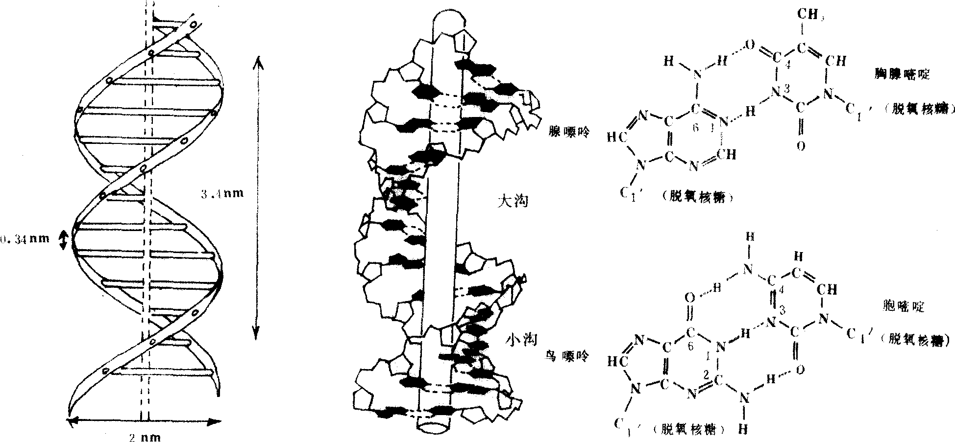 | 释义 | 双螺旋模型shuangluoxuan muxinDNA二级结构模型,是美国科学家沃森和英国科学家克里克于1953年共同提出的,又称沃森-克里克模型。这个模型的要点是:(1)DNA分子由两条多核苷酸链组成,这两条链互相平行,但方向相反,它们都围绕同一假想公轴向右旋转,螺旋的每一转含有一个大沟和一个小沟,螺旋的直径是2纳米。(2)碱基上的原子处在同一平面上,糖环也基本上是个平面,这两个平面相互垂直。碱基对平面穿过螺旋轴,约与轴垂直。两条螺旋形的、由脱氧核糖与磷酸构成的主链在分子的外部,主链上伸出的扁平碱基在分子的内部,并被氢键连接成对。碱基配对的规律是A和T(用2个氢键相连),G和C(用3个氢键相连)。碱基相对不溶于水,因而是疏水的。碱基对的平面堆积在DNA分子内部形成了疏水核心。碱基对平面之间的距离是0.34纳米。每一个完整的螺旋恰好有10个碱基对。螺距是3.4纳米。按照沃森-克里克模型,DNA是由2条右手螺旋的反平行多核苷酸链组成,如一条链的方向是5'→3',另一条链的方向就是3'→5'。这两条链的碱基序列虽然不一定相同,但彼此有“互补”(碱基配对)的关系。碱基对平面内的氢键和平面间的疏水相互作用,是双螺旋结构的主要稳定因素,尤以后者更为重要。沃森和克里克提出双螺旋模型的依据是当时已获得的物理和化学的分析资料。化学分析表明,在不同来源的双链DNA样品中,腺嘌呤(A)和胸腺嘧啶(T),鸟嘌呤(G)和胞嘧啶(C),以及嘌呤总量(A+G)和嘧啶总量(T+C)的摩尔比都大约为1。X-射线衍射分析证明,DNA纤维有螺旋构型和3.4纳米及0.34纳米两个周期性变化。在沃森和克里克之后,许多学者用实验证明了DNA双螺旋结构的正确性。这个模型不但阐明了DNA的结构,并且为一个DNA分子如何复制成两个相同结构的DNA分子,以及怎样传递生物体的遗传性状提供了合理的说明。这项工作为现代分子生物学的建立,起到了关键性的作用,受到了科学界的普遍重视。为此,沃森、克里克和DNA的X射线衍射研究者英国的威尔金斯(M.H.F.Wilkins)同获1962年度生理学或医学诺贝尔奖。