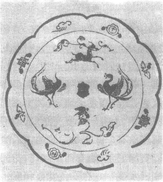 | 释义 | 双鸾奔马铜镜唐。直径22.5厘米,边厚0.6厘米。1986年陕西省商洛地区制药厂工地出土。陕西省博物馆藏。铜镜呈八瓣葵花形,正面微鼓,呈铅灰色。背面呈纯黑色,中央有半球形圆钮,钮两侧各高浮雕一鸾,做展翅翘尾状。上方有一备鞍奔驰的骏马,口衔枝蔓,四蹄腾空,马头顶部有突出一物,似为独角。边沿饰两两对称的云纹、葵花纹、花果纹及回字形纹、葵花纹,并分别铸有“千”、“秋”二字,与其花纹结合,寓长寿之意。此铜镜布局整齐,纹样秀丽,制作精工,从装饰的艺术风格和铭文字体来看,应为唐镜。