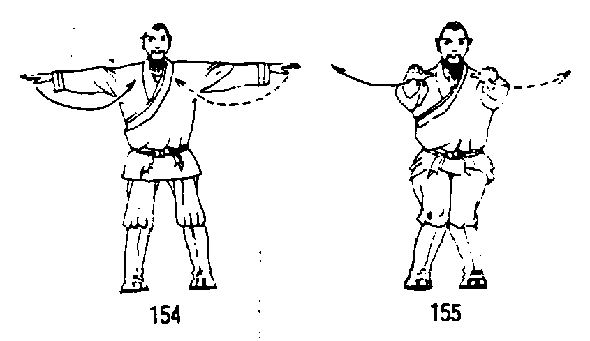 四十九式经络动功第4段“归元”动作之二(全套动作顺序第四十三式):❶随着吸气,提肛调裆;两腿伸直;同时两掌分别以腕关节尺侧端领先向两侧弧形上摆,掌心朝下;眼平视前方。(图154)❷随着呼气,松腹松肛;两腿下蹲,合膝裹裆;同时两掌心朝下以腕关节桡侧端领先略向上、向里划弧至胸前,两臂自然伸直;两眼意视两掌心劳宫穴。(图155)练功次数:一起一伏、一开一合为1次,共做3次。要点:意在劳宫,气沉丹田,轻飘徐缓,舒适自然。