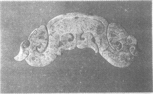 西汉早期。通长10.7厘米,中宽3厘米。1983年广东省广州市南越王赵昧墓出土。广东省广州市南越王墓博物馆藏。青玉,上有浸蚀痕。以并体双龙作璜形。玉龙透雕而成,身体弯曲作回首状。龙角短粗外扬,龙尾卷于身下,龙身饰阴线弧状纹。佩正中和龙颈之下各有一圆穿可系绳佩挂。