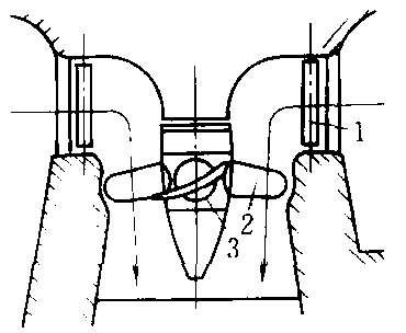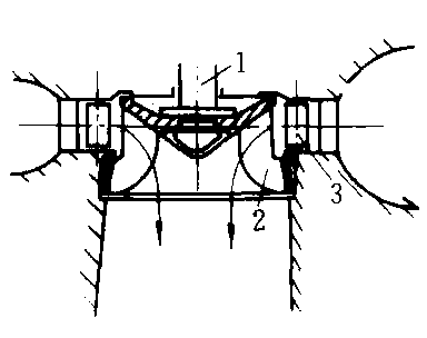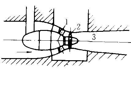 图4 贯流式水轮机 1.导叶 2.转轮叶片 3.尾水管 |