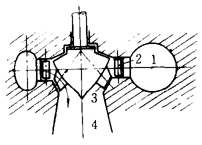 图3斜流式水轮机 1.蜗壳 2. 导叶 3.转轮叶片 4.尾水管
