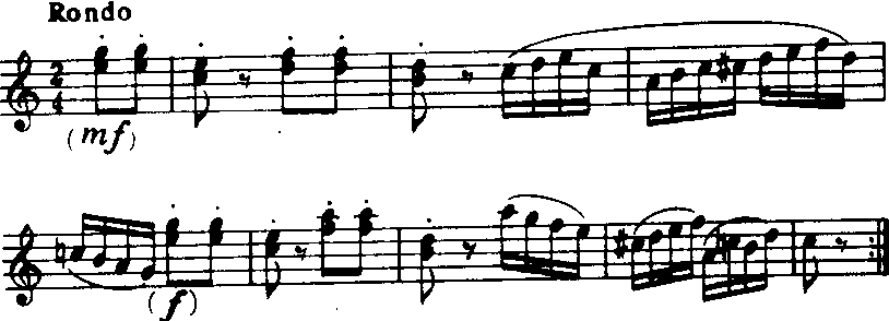 它的内部有两种因素:一是以平行三度跳进的,下方声部并作相应的模仿;一是以16分音符作旋转运动,这两种因素在全曲起着积极的作用。第一插部在G大调,开始是以活跃的16分音符为基础,具有类似中段的性质。而后是再现,但它不是在主调而是在属调。经过简短的连接主部再现后出现第二插部。第二插部从左手开始于平行a小调,仍是主题同一材料的演变(大调性变为小调性)。而乐句的规模较大,有声部的互换及补充,后乐句末尾并转变为连接。当主部再次再现后出现尾声,最后以强有力的力度结束全曲。