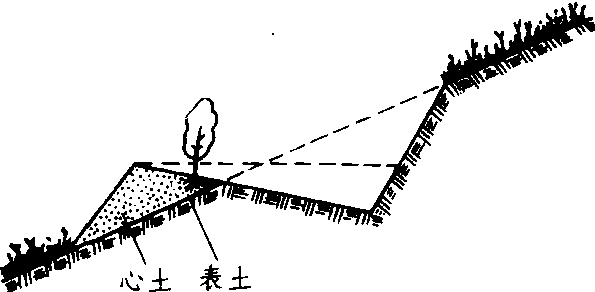 反坡梯田整地示意图 反坡梯田一种沿等高线修筑的坡面为外高里低的小型梯田。这种整地方法是1958年定西巉口林场的科技人员在原苏联专家设计的启示下, 经与其他整地方法的对比试验中总结出来的。适用于坡面完整、坡度为15~35度的荒坡。荒山坡度为15~25度时田面宽1. 5~2. 5米;25~35度时宽1米。据测定,在30度左右的坡面上,挖土部分达到总面积的40%以上,宽度不小于2米,能拦蓄100毫米的降雨而不产生大的水土流失, 比水平沟整地能提高土壤含水率4.14%,而且土壤有效磷增加3~5%,有效钾增加15~30%。用此法整地后, 定西巉口林场所营造的油松、侧柏水保林,其成活率达90%以上,同期截干栽植的榆树, 在反坡梯田内的比在水平沟内的高60厘米。 |