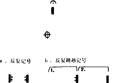 记谱法中的简略记法之一,乐曲部分或全部重复时使用的记号。❶段落反复记号 (见例a)表示将该段落重复演奏一次,歌曲则视其有几段歌词而反复几遍; 如果是从头重复,谱首的反复记号可以不写。❷反复跳越记号(见例b)。表示结尾不同时,第一遍唱(奏)标记1. 处反复后第二遍跳过标记1. 接唱 (奏) 标记2处。❸反复略语标记D. C. a|Fine记在段落结尾处复纵线下方,表示由此处开始从头反复至标有Fine (曲终) 或——处结束。结果不是从头反复则在段落处记写D.S.表示从记有(S的花体)处反复。若乐曲重复后有若干小节不需重复,则标记号该部分开始小节前与末尾小节后的小节线上,表示反复后应跳过该部分继续演奏。