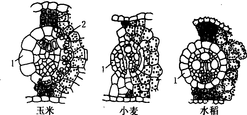 根据C4植物中催化脱羧反应的酶的种类不同,又可将其分为三类:❶NADP-果酸酶类型。C4二羧酸从叶肉细胞运到维管束鞘细胞后,在NADP-苹果酸酶催化下脱羧释放CO2,如玉米、高粱; ❷NAD-苹果酸酶类型。催化脱羧反应的酶为NAD-苹果酸酶,如谷子; ❸PEP羧激酶类型。催化脱羧反应的酶为PEP羧激酶,如大黍、虎尾草。 在C4植物中农作物很少,多数是生活力很强的杂草,所以研究如何抑制C4途径以抑制杂草的光合作用,在农业生产上也有实用意义。 C4植物C4 plant又称四碳植物。通过光合C4途径(见“光合碳同化”)固定同化CO2的一类植物。如玉米、高粱、甘蔗。多起源于热带,叶片解剖特点是维管束周围两层细胞呈花环状,内圈为维管束鞘细胞,体积大,有叶绿体,外圈为叶肉细胞。CO2羧化在叶肉细胞中进行,产物可转移至维管束鞘细胞,经脱羧转入C3途径,再同化为碳水化合物。C4途径具有CO2泵的效应,使维管束鞘细胞CO2浓度提高,促进RuBP羧化酶的羧化反应,抑制加氧活性。光照较强,温度较高时,C4植物光合速率明显高于C3植物,光呼吸低。光合最适温度较高,CO2补偿点较低,光饱和点较高。但C4途径耗能也较多,因而在低温弱光下,C4植物光合效率并不高,甚至低于C3植物。