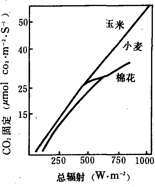 C4植物从大气中吸收的CO2先在叶肉细胞内固定在C4-双羧酸中,CO2受体为磷酸烯醇丙酮酸 ( PEP),催化这一反应的酶为PEP羧化酶,该酶与CO2 有较大的亲和力,故C4植物能固定充分的CO2在C4 -双羧酸中,后者运到维管束鞘细胞后,脱羧释放出的CO2进入C3途径同化为糖及淀粉等; 脱羧后形成的C3 化合物从维管束鞘细胞转回叶肉细胞再转变为CO2受体PEP,形成一循环。C4途径起CO2泵的作用,使1,5-二磷酸核酮糖(RuBP)羧化酶—加氧酶作用部位的CO2浓度增高,故促进羧化反应而抑制加氧反应,使光合速度增高而光呼吸受到抑制。C4植物光呼吸速度很低,一般在光下不释放CO2,CO2补偿点也很低,约0~10ppm,所以环境中CO2浓度在10ppm以上即可进行光合作用。C4植物光合作用的光饱和点较C3植物高(图2),在自然光强范围内光合速率随光强增加而增高。C4植物的光合最适温较高,约30~40℃。在温度较高、光照较强以及相对湿度较低的条件下,C4植物的光合效率明显高于C3植物; 但其高光合速率需要消耗较多的能量,如C4植物玉米每同化一分子CO2,除在C3途径中需要消费与C3植物同样多的同化力(2分子NADPH和3分子ATP)外,在C4 途径中还需2分子ATP,故在光强及温度较低的条件下其光合效率并不比C3植物高,甚至还低一些。此外,C4植物在低温下其C4途径中的PEP羧化酶及丙酮酸、磷酸双激酶不稳定,且叶肉细胞内丙酮酸载体及磷酸运转器的作用在低温下受到抑制,因而使丙酮酸从细胞溶质运到叶绿体以及PEP从叶绿体运到细胞溶质受抑制,影响C4途径的运转,光合效率减低。