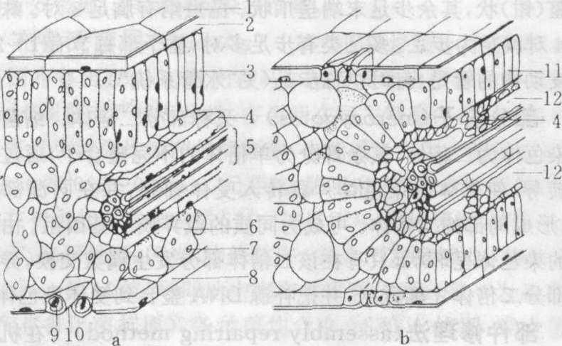 C3植物和C4植物叶片解剖结构 a.C3植物 b. C4植物 1.角质 2. 上表皮 3.栅状细胞 4. 维管束鞘细胞 5. 叶脉 6. 海绵细胞 7. 叶绿体 8. 下表皮 9.保卫细胞 10. 气孔 11. 叶肉细胞 12. 液泡 C3植物C3 plant又称三碳植物。通过光合C3途径固定同化CO2的一类植物。如水稻、小麦、大豆等,其维管束无花环状结构(见“C4植物”图),光合作用只在叶肉细胞内进行,通过二磷酸核酮糖羧化酶一加氧酶固定CO2。该酶也可催化加氧反应,产生磷酸乙醇酸,它的水解产物(乙醇酸)是光呼吸的底物。由于羧化反应和加氧反应同步进行,所以C3植物光呼吸一般较强,约占CO2同化量的1/3。CO2补偿点较高,光饱和点较低,光合作用的最适温度也较低。光强超过光饱和点,温度高于最适温时光呼吸显著升高,不利于有机物积累。 |