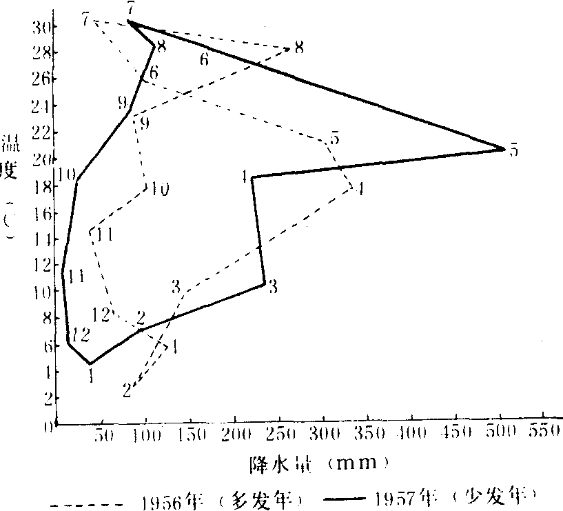 式中 Q为水分积分指数,x为雨量,y为雨日数,σx为常年雨量标准差,σy为常年雨日标准差。 ❸综合猖獗指数; 将气候因素和虫口密度等综合统计计算,分别求出大发生年、中发生年和轻发生年的综合指数,作为某种害虫未来发生量预测的依据。 ❹天敌指数; 在分析当地多年害虫数量、天敌数量及其攻击力的关系的基础上,通过实验测出该天敌攻击力,可求出害虫数量与天敌数量及其效应比值的天敌指数,根据田间调查的害虫和天敌数量,可以预测未来害虫数量趋势。 生物气候图预测法 适用于以气候因素为主导影响因素的害虫。生物气候图是以当地月(旬)总降雨量或相对湿度为纵坐标,月(旬)平均温度为横坐标,点绘成散点图,进而连成一不规则的闭合多边形图线。与历史上害虫大发生年和少发生年,或多发地区和少发地区的生物气候图相比较,估计其发生程度(见图)。图中纵坐标为月平均温度,横坐标为月降水量。亦可将害虫各虫态的适宜温、湿度(或降雨量)上、下限标在坐标上,绘成四边形,再将当地当年预报值按前述方法绘成气候图,若害虫发生季节的预报值点线落在相应虫态的四边形内,示将大发生,否则发生轻微。