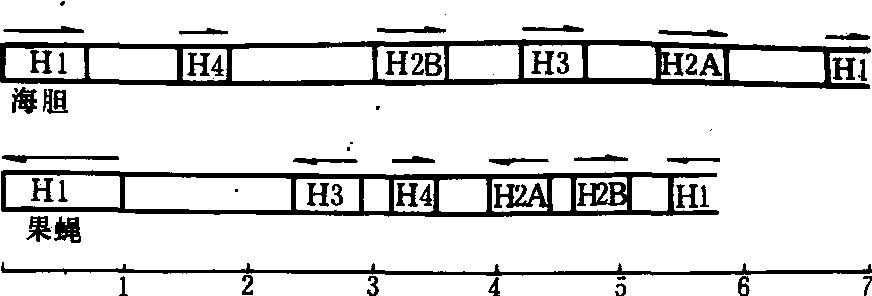 千碱基海胆和果蝇组蛋白基因簇示意图 (注: 五个主要组蛋白基因编码区段之间,由五个间隔区交替割开。间隔区与断裂基因中的间隔序列不同,前者是一种非转录的区段,后者是可转录的间隔子。图中箭头表示转录的方向。) 高度重复序列包括卫星DNA中的短序列和一些大量存在的基因的正常序列,例如,rRNA基因可多达数百份。这类rRNA基因有两方面突出的特点: 其一,这些基因是串联重复的,几乎所有真核生物的rRNA基因的拷贝数都超过100份。其二,大部分的rRNA基因,都是位于染色体中同核仁结合的特殊部位。已知在卵母细胞中,编码rRNA分子的基因几乎占总DNA的75%。生物体以rRNA基因和组蛋白基因这种多拷贝的形式,增加基因的剂量,提高蛋白质合成的速率和效率,这可能是一种特例并非普遍的模式。因为已经知道,许多重要的蛋白质都是由单拷贝基因编码的。例如,丝心蛋白的单拷贝基因,能够合成高达104mRNA分子,合成后的数天内仍是稳定的,而每个mRNA分子又可合成105左右的蛋白质分子的模板。因此,一个单拷贝的基因,在四天内就可合成109的蛋白质分子。单拷贝基因这种高度的表达能力,对于基因操作无疑是极为有用的。 |