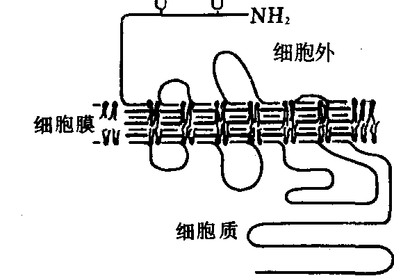 | 释义 | 受体receptor细胞膜或细胞内能识别外来信号(配体),并与之结合,将其转换成细胞内部信号,从而诱发、改变或调节细胞生理活动的物质。存在于细胞膜者称质膜受体,分布于细胞内者称细胞质受体或细胞核受体。关于受体的组成有人认为受体仅指与配体特异性结合的识别部位; 也有人认为完整的受体应包括识别部分、效应部分和调节部分,至少应包括识别部分和调节部分。如β-肾上腺素能受体的识别部分为单链多肽,即狭义所指的受体,效应部分为腺苷酸环化酶(AC),而调节部分为三磷酸鸟苷结合蛋白(G蛋白)。但此三者在细胞膜内通常不直接结合在一起,而是各自分开,并且在一定条件下可以移动。当识别部分与相应配体特异性结合后,调节部分和效应部分才相继被激活和偶联,因此有人又称之为受体系统。动物体内免疫细胞识别抗原物质、激素作用于靶细胞、神经递质对触突后膜的作用和触突后电位的产生、受精过程和胚胎发育过程中的组织分化与形态发生、甚至低等生物的结合生殖等都可能有受体在发挥作用。此外,受体与某些药物和疾病都有密切关系。关于受体的研究,近20年来进展迅速,不仅可用电镜组织化学方法观测某些受体在细胞的存在部位,而且有些还可用生物化学方法提纯,甚至利用生物工程技术探讨受体的分子结构。已知β-肾上腺素能受体为一条多肽链,具有7个分别由20~25个氨基酸残基组成的疏水跨膜区段,各区段之间由数目不等的氨基酸残基组成的环相连接(图1)。此外,用放射配体结合测定法可以直接识别与放射配体相应的受体,测定其数量及其与配体相结合的动力参数。