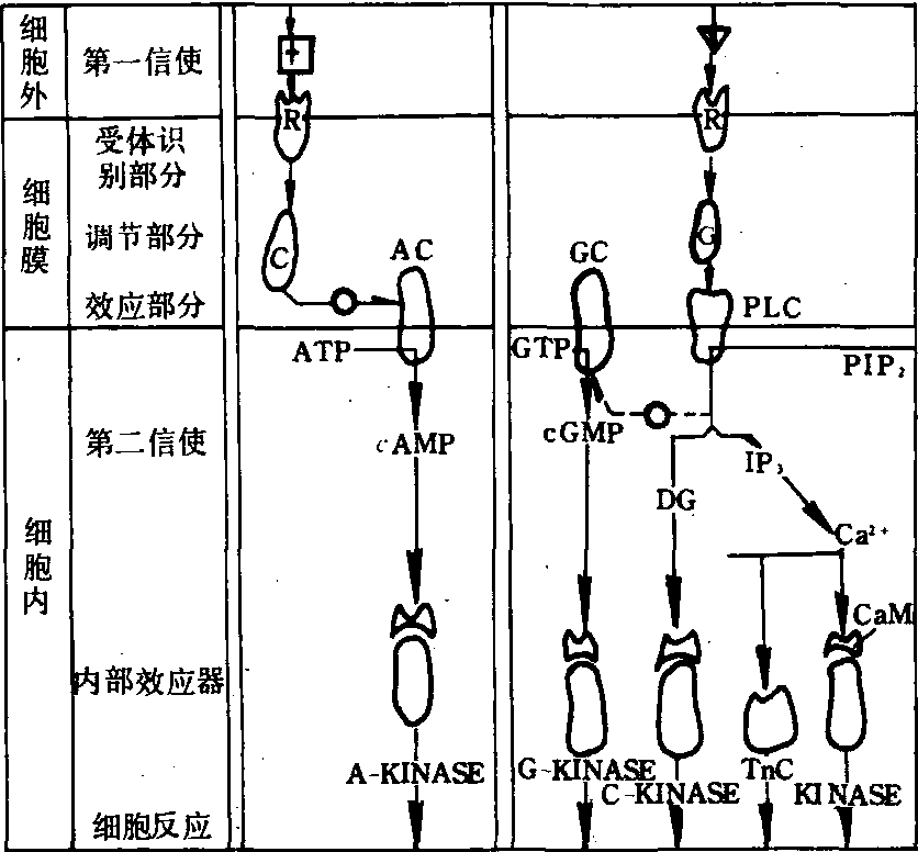 质膜受体 包括神经递质、大部分含氮激素和局部调质,以及多种与上述物质类似的药物受体,还有各种毒素(如白喉毒素、霍乱毒素、蓖麻毒素等)和病原体(病毒、噬菌体、细菌和寄生虫)的受体,以及免疫系统中的白介素受体、抗体Fc受体、补体受体和T、B细胞的抗原受体等。这类受体的配体在作用过程中不进入细胞,称第一信使,当其被受体识别并与之结合后,通过调节质膜上的酶活性及离子通道,引起细胞内产生继发信号,称第二信使,再由第二信使引起细胞产生特异的生物效应。目前,根据质膜受体的分子结构、信号传递机理以及它们之间相互关系,可将质膜受体分为三类。 第一类质膜受体 包括烟碱型乙酰胆碱受体、γ-氨基丁酸受体和甘氨酸受体,还可能包括其他氨基酸类神经递质的受体。它们大多由数个亚基组成,其中除含有与配体结合部位外,本身就是依赖于神经递质的离子通道。当受体未与配体结合时,通道处于关闭状态;与配体结合后则发生构象变化而离子通道开放,并借以向细胞内传递信号。 第二类质膜受体 包括所有需与G蛋白偶联的受体,如肾上腺素能受体、毒蕈碱型乙酰胆碱受体和视紫红质(视杵细胞的光受体)等。这类受体多为单链多肽,具有数个跨膜区段,当其与相应配体结合后,立即激活各自的G蛋白,并分别通过各自的机理调节相应酶的活性,将信号传递至细胞内。它们的信息转换系统有环磷酸腺苷(cAMP)—蛋白激酶A(PKA) 系统、肌醇三磷酸酯(IP3)—Ca2+—钙调蛋白(CaM)—蛋白激酶(PK)和甘油二脂(DG)—蛋白激酶C(PKC)系统以及光受体—环磷酸鸟苷(cGMP)系统等(图2)。 cAMP—PKA系统 以肾上腺素作用于肝细胞膜上的β-肾上腺素能受体为例,简要说明这类受体与配体结合后所引起的变化,信息转换系统的活动及其所引起的生物效应。肝细胞的β-肾上腺素能受体与肾上腺素结合后,受体随即发生变构,细胞膜的磷脂则甲基化,生成磷脂酰胆碱或卵磷脂,膜的流动性因而增大,粘度降低,变构的受体遂向G蛋白靠拢,并与之结合,使其活化。活化了的G蛋白与细胞质中的三磷酸鸟苷(GTP)结合,致使本身的构象发生改变,进而与AC结合,使其活化,并催化腺苷三磷酸(ATP)形成cAMP。然后G蛋白又起三磷酸鸟苷酶的作用,将GTP水解成为鸟苷二磷酸(GDP),结果G蛋白恢复成为无活性状态,而AC亦失活。cAMP即肾上腺素作用于肝细胞膜上的β-肾上腺素能受体过程中所产生的第二信使,在细胞质中引发的一系列酶触反应如下: cAMP激活PKA,PKA一方面激活磷酸化酶激酶,进而激活糖原磷酸化酶,活化了的 原磷酸化酶又催化糖原分解成为1-磷酸葡萄糖;另一方面,被激活的PKA还可促使糖原合成酶磷酸化,而磷酸化了的糖原合成酶失去活性,从而抑制糖原的合成。结果cAMP在细胞内浓度的增加既刺激糖原的分解,又抑制糖原的生成,致使细胞中葡萄糖的含量明显增长。在以上过程中,一个活化了的受体可以激活多个G蛋白,将传递的信息逐级放大,并迅速传播到整个细胞,所以微量的外来信息分子即可有效地发挥作用。