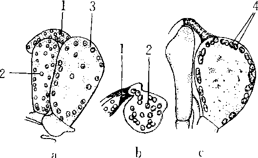 受精丝 a.配子囊 b.质配 c.细胞核配对 1.受精丝 2.雄器 3.产囊器 4.细胞核配对 |