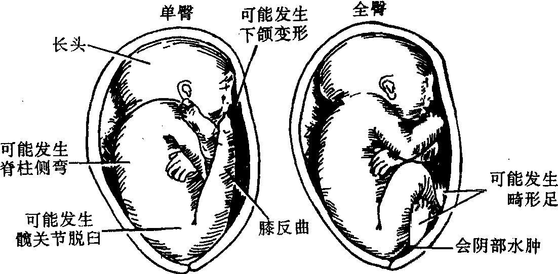 | 释义 | 变形序列病由于正常胎儿在子宫内受到不正常的压力,因而产生了变形也即假畸形(见先天变形条)。变形可以是单发的也可以是多发的。多发变形中各变形之间可以是没有联系的,例如来自不同原因压力所产生不同部位的变形;也有的是来自一个共同原因造成的一系列变形,后者就称为变形序列病。这种变形如果去除这个共同的原因,全部可以恢复或不再发生。臀位序列病就是一个例子,由于正常情况下胎儿小的部分就是头部应当在下面,胎儿大的部分就是臀部和下肢应当在上边,因为子宫腔也是上大下小。但是如果胎位不正,大的部分在下边要受压挤,小的部分在上边也不适合,因而上下边都会有发生变形可能。最常见的变形例如头在子宫腔上边可以变成长头(舟状),在宫底压迫下可以发生斜颈,脊柱侧弯,下肢在下边受两侧挤压可以产生髋关节脱臼,腿如为直伸位可以发生膝反曲,如为屈曲位可能发生畸形足,会阴部受压也可以发生水肿等,如果是托腮还可发生下颌的改变,总之,臀位时全身各处的变形都可能发生。但是出生后又都可能纠正,愈后较好(见图10.7-1)。又如妊娠早期胎头受压可以低向胸骨而使胸骨发生凹陷,下颌也可改变,由于头低位使舌根上提可以阻碍了两侧腭板的闭合成“U”字形腭裂等异常。这一系列变形称为Robin氏(发现者的名字)变形序列病。知道有这样一种变形序列病,当发现一系列多发异常时应进行分辨。如能诊为变形序列病比多发畸形预后要好。和变形与畸形的区别一样,其预防、治疗和复发机会都和多发畸形不同,因此应当普遍知道有这类病,才有利提高人群中卫生知识的水平。