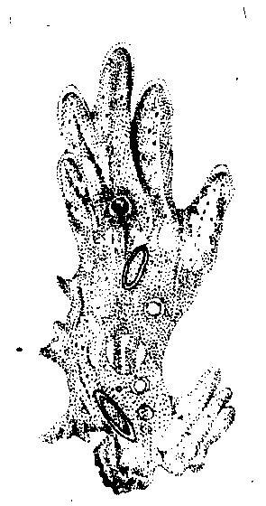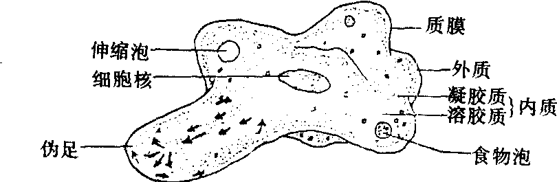 图117 变形虫的结构 变形虫Bianxingchong原生动物门肉足纲的动物,亦称为阿米巴。变形虫体形不固定,体表为一层薄的细胞膜,细胞质分为较透明的外质和致密的具颗粒的内质,内质中具一扁盘状细胞核和调节水分平衡的伸缩泡。变形虫可通过内质的流动在身体任一部位产生临时性突起,称为伪足,是运动和摄食的细胞器。变形虫以藻类、细菌和其它原生动物等为食物,通过吞噬作用在内质中形成食物泡,还可通过胞饮作用摄取水溶性营养物,不能消化的食物残渣留在身体相对的后端排出。变形虫常以无性的二分裂繁殖;有些变形虫还可包囊化以抵抗不良环境,在条件适宜时,虫体在包囊内一分为二,破囊而出。变形虫生活在缓慢流动、水质洁净、藻类丰富的浅水中,常附着在水生植物的茎叶上或水底泥沙表面。由于变形虫为结构简单的单细胞有机体,个大而易于培养(大变形虫可达600微米),因此可做为细胞和分子水平研究生命现象的实验材料,也是动物学教学的极好的实验材料。
