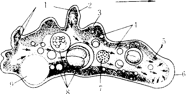 变形虫的构造及伪足的形成(箭头示运动方向) 1.溶化区 2. 质膜 3. 外质 4. 内质 5. 凝化区 6. 伪足 7. 核 8. 食物泡 9. 伸缩泡 |