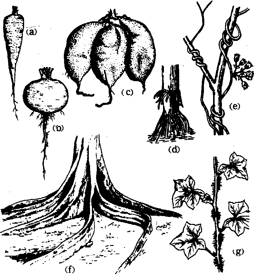贮藏根 根体肥大,具有发达的薄壁组织,内贮大量养分,多见于二年生或多年生草本植物中。根据发生来源不同,又可分为两种。 肉质直根 由主根和下胚轴膨大发育而来,外形呈圆锥状或纺锤状、球状等。萝卜、芜菁、胡萝卜的肉质直根很发达,为日常食用的蔬菜; 甜菜根中含糖量高,可制糖或作饲料用。 块根 由侧根或不定根发育而来。菊芋、大丽花的块根中含菊糖,甘薯、木薯块根的薄壁组织中含大量淀粉。其他如乌头的块根含乌头碱,为镇痉、镇痛药,麦冬块根含有多种甾体皂甙,能滋阴生津、润肺止咳。 气生根 生长于地面的根均称气生根。气生根的内部常有比较发达的厚壁组织。依生理功能不同,分为下列数类。 支持根 由地上茎起生的不定根,穿入土壤,形成起支持作用的辅助根。玉蜀黍、高粱、甘蔗在近地面的茎节上能成圈地生出一些支持根。榕树从茎枝上产生许多下垂的气生根,部分气生根一直伸入土层,通过次生生长,形成粗大的支持根,树冠扩展的大榕树能呈现一树成林的壮观。 板根 板根常发生于一些热带树种中,如 Erio-dendron aufractuosum、Khaya ivorensis、香龙眼、臭楝、漆树科的人面子,红树科中的一些种类等。板根是在特定环境下,主根发育不良,侧根向上侧隆起生长,与树干基部相接部位形成发达的木质板状隆脊。有的板根高可达数米,增强了对巨大树冠的支持力量。 攀援根 常春藤、凌霄、络石等藤本植物的细长茎上能生出一些短的不定根,这些根的顶端扁平,有的成为吸盘状,易固着于石头或树干表面,具有攀援功能。 附生根 热带湿润气候的森林中,一些兰科、天南星科植物的气生根,能附着于木本植物树皮上,并从树皮缝隙内吸收蓄存的水分。这种根的外表形成根被,由多层厚壁死细胞组成,可以贮存雨水、露水,供内部组织用。干旱季节,根被失水而为空气所充满。附生根内部的细胞往往含有叶绿体,有一定的光合作用能力。 呼吸根 分布于沼泽地带或海岸低处的一些植物,例如水龙、红树、落羽松、海桑树等,它们的根系中,有一部分根向上生长,露出地面,成为呼吸根。呼吸根一般具有较发达的通气组织,有利于植物呼吸。 寄生根 高等寄生植物或半寄生植物所形成的一种从寄主体内吸收养料的变态根,常又称为吸器。菟丝子苗期产生的根,生长不久即行枯萎,以后从缠绕茎上由不定根变态而形成一些突起的垫状物,垫状物紧贴寄主豆科植物的茎、叶表面,并由其中形成吸器。吸器顶端的长形菌丝状细胞伸入寄主内部组织。当吸器中分化出的维管分子与寄主维管束相连时,便能从寄主体内不断摄取水分和养料。寄生于山茶科、桃金娘科中的一些植物上的无根藤属和寄生在瓜类和向日葵等植物上的列当属植物,也都通过寄生根吸取寄主的营养物而维持生活。山萝花、槲寄生属为半寄生植物,除了通过寄生根由寄主体内获得养料外,还能依靠本身的绿色茎、叶制造部分有机养料。 变态根由于功能改变所引起形态和结构发生变化的根。参见“根”。 变态根modified root形态、结构和生理机能发生显著变化的根。这种变异特性是植物体长期适应环境的结果,能够遗传。变态根的主要类型有: |