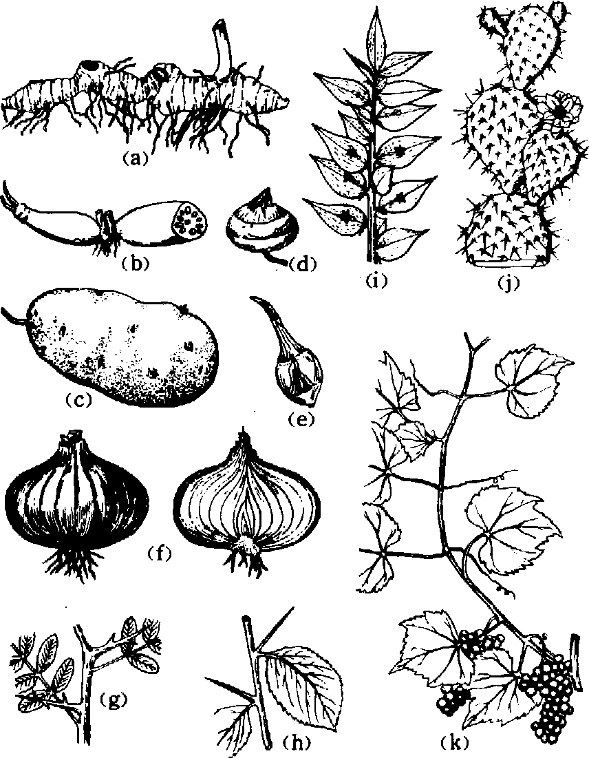 鳞茎 由多数肉质鳞叶着生于短缩鳞茎盘上而形成的一种地下茎。各鳞叶腋内生有侧芽,可发育出新的鳞茎,鳞茎盘下端产生不定根,鳞茎盘中心生有顶芽,以后伸长为地上花序(花葶),如百合、洋葱、蒜等。 块茎 不规则块状的肉质地下茎。如菊芋和马铃薯等植物均形成块茎。马铃薯块茎是由植株基部的匍枝顶端经增粗生长发育而来。其顶端生有顶芽,四周有螺旋排列的芽眼。芽眼的上方生有小的鳞片叶,以后脱落,留下痕迹。芽眼中生有数芽,可萌发成枝。芽眼所在部分相当于茎节,在螺旋线上相邻的两个芽眼之间为节间。成熟的马铃薯块茎,外表为周皮覆盖,内部组织含有许多淀粉粒和少量蛋白质晶体。 球茎—球形膨大的地下茎。有节与节间之分,节上生有鞘状鳞片叶,腋芽位于鳞片叶内侧。球茎先端有顶芽存在,下部形成许多不定根。慈姑、荸荠、番红花、秋水仙等植物能形成球茎,其中富含淀粉。 根状茎 横走蔓生于土壤中的地下茎。节与节间明显,节上除能产生不定根外,在退化的鳞片叶腋内生有侧芽,以后发育出地上枝。根状茎通过顶芽的活动,在土壤中不断横行生长。芦苇、竹有发达的根状茎,侧芽向地面萌发出地上枝,植株繁殖迅速。刺儿菜、狗牙根、香附子等杂草的根状茎蔓生能力很强,节节均可萌芽生根。莲的根状茎为食用的莲藕,沉生水中,具有发达的通气组织,内部富含淀粉,可以提制藕粉。黄精、玉竹、三七等药用植物的根状茎为重要药材。 肉质茎 肥大多汁、内贮大量水分和养料的地上茎。肉质茎上的叶多退化或形成刺,表皮的角质膜发达,气孔器少而常陷生,能抗干旱。靠近表皮的几层皮层细胞含有叶绿体,有行光合作用的机能。生长于旱生环境的植物,如仙人掌、仙人鞭、大戟科的某些植物、木棉科的纺锤树均形成肉质茎。 叶状茎 外形扁化或呈线形,内部形成绿色组织,具有叶的形态和功能的一种变态茎。例如竹节蓼、昙花、假叶树的茎扁化似叶,叶子减小或退化。观赏的文竹、可作蔬菜的石刁柏、药用的天门冬,其变态茎呈细线叶状。 茎刺 由幼枝变态而形成的长形刺状物,对植物本身起保护作用。茎刺位于叶腋,由腋芽发育而来。其内部的木质部与茎的木质部相连,不易折断。柑桔、山楂茎上具有这种茎刺。皂荚的茎刺能出现分枝,石榴、梨中可以看到生叶和花的小枝逐渐过渡到茎刺的过程。茎刺与蔷薇、月季等茎上散生的皮刺不同。 茎卷须 由叶腋间长出的枝条变态形成的须状物,能卷缠它物而攀缘生长,如南瓜、葡萄、乌蔹莓等。 小鳞茎 卷丹、百合的叶腋内能产生与鳞茎相似的膨大芽体。又称珠芽或铃余子。富含养料,脱离母体后可行营养繁殖。大蒜和小蒜的花间也能形成小鳞茎。 小块茎 黄独、薯蓣、秋海棠等植物的叶腋内,常能形成一种类似地下块茎、但无鳞片的肉质小球。 变态茎形态、结构和功能特化的茎的总称。包括地上茎的类型如茎刺、茎卷须和地下茎的类型如块茎、鳞茎、球茎、根茎等。 变态茎modified stem形态、结构和生理功能发生显著变异的茎。其形成是植物体长期适应环境的结果,变异特性可以遗传。变态茎可分为地上变态茎和地下变态茎两大类。地上变态茎的主要类型有:肉质茎、叶状茎、茎刺、茎卷须、小鳞茎(珠芽);地下变态茎有:鳞茎、块茎、球茎、根状茎等。 |