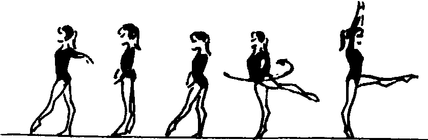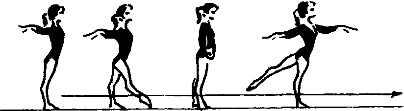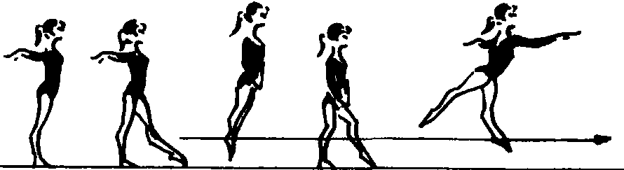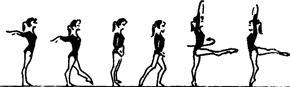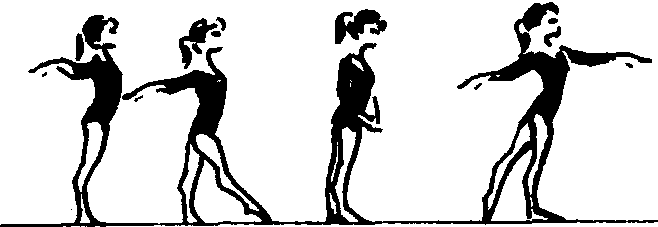 动作要领 上体正直,髋正,后腿点地或后举时膝和脚背稍向外转。转体时当支撑腿经稍屈膝提踵的同时,摆动腿以脚尖的力量带动身体完成转体。跳时支撑腿经稍屈膝用力蹬地向前上方跳起,使身体重心向上。整个动作要求连贯、舒展,姿态有力度,两臂动作与步法协调配合。 教学重点 先学双手叉腰慢动作体会重心的移动,基本掌握后可配合各种手臂动作。一般先学习普通变换步,再学习转体变换步和变换步跳。做变换步跳时可采用2/4、4/4或中速3/4拍乐曲。 |