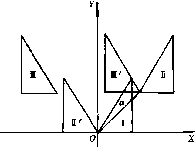 例如,如图,F1是一个沿a的方向和大小移动的平移变换,F2是一个关于Y轴的对称变换,则经过F2·F1,图形Ⅰ变到了图形Ⅱ,又变到了图形Ⅲ.把图形Ⅰ变到图形Ⅲ的变换F,就是F1和F2的乘积,即F=F2·F1. 在一般情况下,变换的乘法不满足交换律,即F2·F1≠F1·F2.如图,先进行变换F2,图形Ⅰ变为图形Ⅱ′,再进行变换F1,把图形Ⅱ′变为图形Ⅲ′,显然F2·F1≠F1·F2.特殊情况下,如两个平移变换的乘积仍是平移变换,而且交换变换的顺序,乘积不变. |