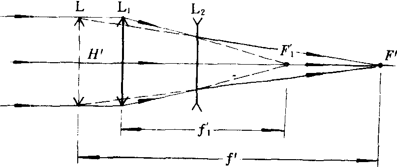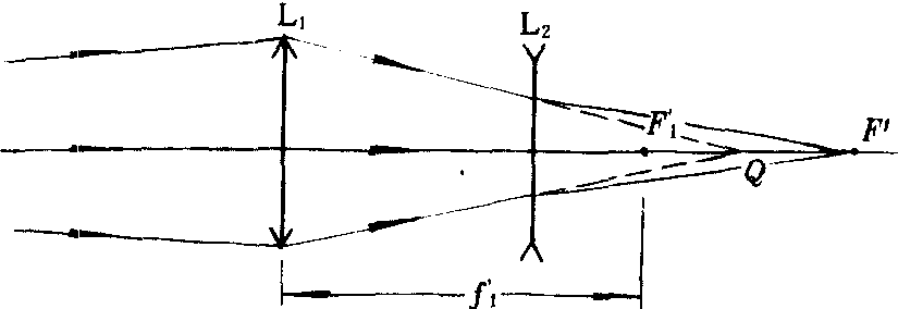 图 1 图中示出了一种最简单的变焦距物镜。它是在凸透镜L1(做物镜)的后面放一个沿轴可移动的凹透镜L2(称调焦镜)。轴上无穷远物点发出的平行光束经L1后,本应会聚于L1的后焦点F1′,但由于L2的发散作用,使会聚点延至F′(图1)。L1和L2构成的透镜组与位于H′的单一凸透镜L成像情况一样,L的等效焦距f′=H′F′大于L1的焦距f1′。对于近处轴上物点的成像,可使调焦镜L2向F′靠近(图2)。由于这时入射光束是发散光束,所以经L1后的出射光束并不会聚于F1′,而是会聚于F1′和F′之间的Q点。但由于L2的发散作用,光束并不真正会聚于Q,而仍是会聚于F′,即像面位置没有改变。但这时F′并不是透镜组的后焦点,而是轴上近处物点的像点,因此等效焦距变短了。用这种变焦距物镜所制成的望远镜,可观察距离为0.5米以上任何位置的物体。目前,在电影和电视的摄影中已普遍使用变焦距物镜,并获得了良好的艺术效果;在望远摄影、显微摄影、宇宙空间探索、导弹实验、追迹观测等多种科技领域,变焦距物镜都得到了广泛的应用;近些年来,在普通照相中也开始使用变焦距物镜。