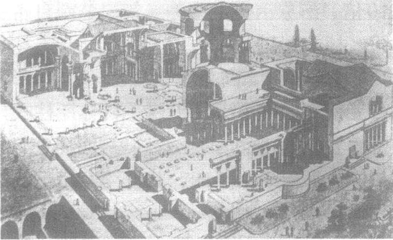 | 释义 | 古罗马公共浴场公共浴场的形式最早出现于古希腊的晚期,古罗马时期把运动场、图书馆、音乐厅、商店等和浴场结合在一起,成为城市交往和公共活动中很重要的建筑物。罗马共和时期的浴场为单层不对称的建筑,帝国时期浴场发展为二层,各辅助房间设在底层,上层浴场平面对称布局。现存规模最大的浴场是罗马的卡瑞卡拉浴场,建于211年—217年,长575m,宽363m,中央是可供1600人同时沐浴的主体建筑,周围是花园,外侧设置商店、运动场、讲演厅以及和输水道相连的蓄水槽,储水可达3300m3。中央浴场为228×116m的对称建筑物,沿中轴线上依次排列冷水、温水、热水三个沐浴大厅,冷水浴大厅没有屋顶,仅在四面墙上装钩子张拉帐蓬,温水浴在高33m,长和宽55.77m×24.08m的中央大厅,热水浴在上有穹顶的圆形大厅,高49m,直径35m。大厅均以天然光照明,室内装饰着大理石墙面,瓷砖地面,并在大厅内的壁龛和装饰柱的柱头上陈设雕像,显得富丽堂皇,浴室大厅二侧对称排列着更衣、洗涤、按摩、蒸汽室等房间和散步的院子,设施十分齐全豪华。
