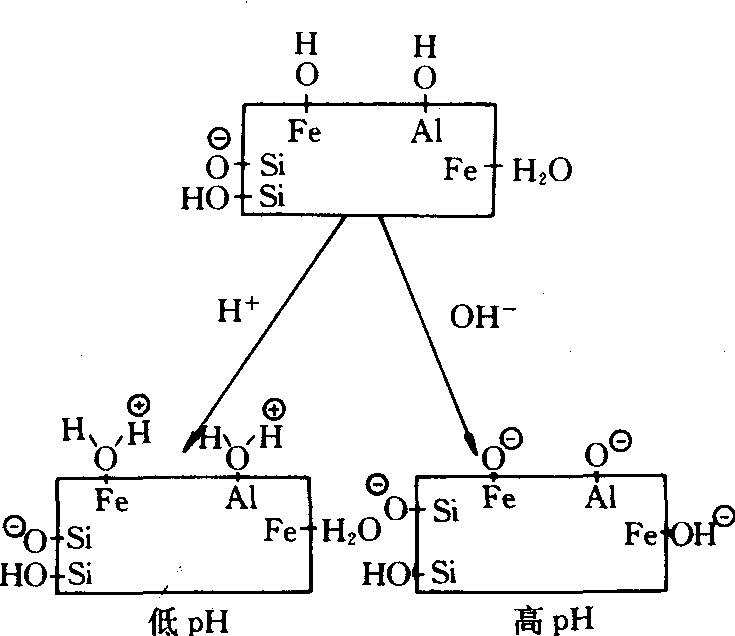 土壤胶体中所有氧化物、水合氧化物和氢氧化物以及水铝英石类矿物的表面均属水合氧化物型表面,都能产生可变电荷。以氧化铁为例,示意如下: