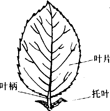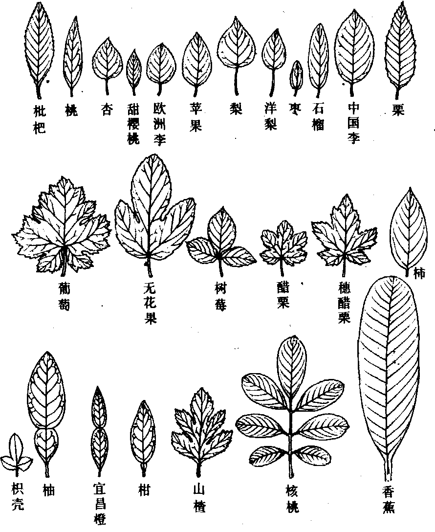 图5 叶形 植物的叶具有叶片、叶柄和托叶的叫做完全叶,如豌豆、桑、苹果、桃、棉等;有的植物并不全具有这3部分,叫做不完全叶。如丁香的叶不具托叶,莴苣的叶无叶柄和托叶。这些都属不完全叶。 叶leaf按一定顺序着生在枝上主要进行光合作用的器官。果树的叶多为完全叶, 由叶片、叶柄、托叶三部分组成(图1)。 图1 苹果的叶 叶的种类和叶序 果树叶大致分为三类:❶单叶,每个叶柄上只有一个叶片, 如苹果、桃、柿、枇杷、菠萝、香蕉等果树; ❷复叶。叶柄上有两个以上叶片,如核桃、荔枝、龙眼、杨桃、草莓等果树; 复叶又以小叶排列的方式不同,分为羽状复叶、掌状复叶和三出复叶; ❸单身复叶。外形似单叶, 由先端身叶(亦称本叶)和叶柄部分的翼叶组成,如柑橘、金柑、橙、柚等果树。每种果树的叶片都有相对固定的形状、大小、色泽和附属物。因此, 叶片的形态特征是区别不同果树种类和品种的依据之一(图2)。