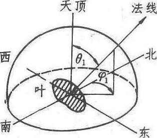 叶片腹面的法线(L)与天顶轴(z轴)的夹角(θL)。它以z轴为0度。实际上它也是叶面与地平面的夹角。一般植物的叶片的腹面,都是朝向地面上半球,于是可以认为叶片法线只在上半球空间2π立体角内变化,因而θL取值范围从。