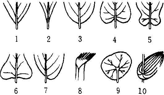 叶基形态 1.楔形 2. 渐狭 3. 钝形 4. 心形 5. 耳垂形 6.截形 7. 偏斜形 8. 鞘形 9. 盾形 10. 茎穿叶形 |