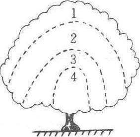 用叶幕层次的分析方法,衡量叶幕结构的生产能力。按果树植株的生态适应性和生产性能,树冠由外向内分为4层:❶强光保护区。入射光强在71%以上,枝叶稀疏,叶厚,叶面保护组织发达,产量较高。❷集中结果区。入射光强51%~70%,叶栅栏组织和表层结构发达,光合能力强,单位体积产量最高。❸内部结果区。入射光强31%~50%,叶较薄,阴性结构,光合效能低,结果量少。❹内部无果区。入射光强在30%以下,较长处于补偿点以下,叶薄,表层结构不发达。要求缩小内部无果区,扩大集中结果区,改善被抑制内部结果区,达到最有生产能力的叶幕结构。