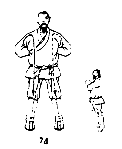 四十九式经络动功第1段“通经”动作之六:随着吸气,提肛调裆,舒胸展体,脚跟拔起;同时两八字掌变成柳叶掌从脊柱两侧向上摩运至腋下,臂内旋成勾手,勾尖朝下,两肘弯屈内收;眼平视前方。(图74)