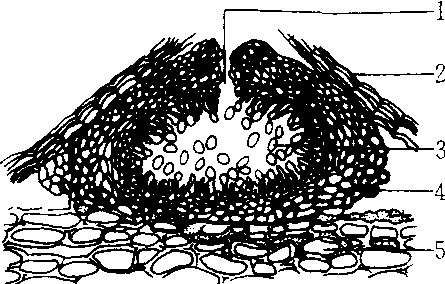 叶点霉属 1.孔口 2. 寄主表皮 3. 分生孢子 4.分生孢子器 5. 寄主细胞 |