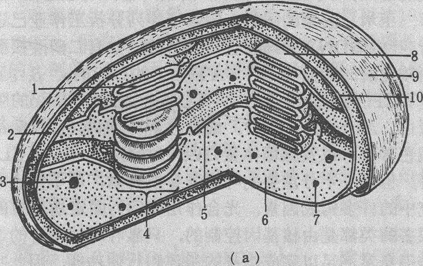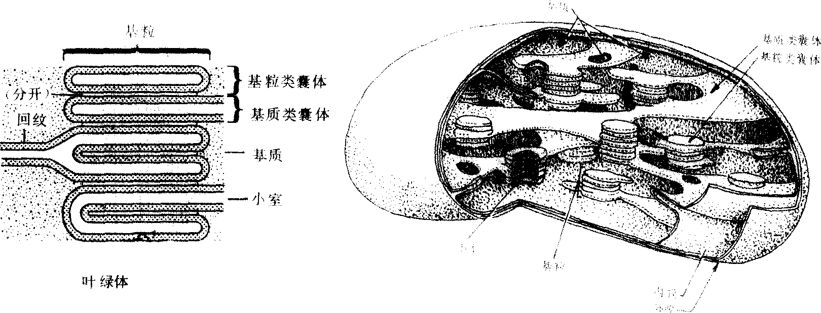 图509 叶绿体结构示意图 叶绿体chloroplast植物绿色细胞所特有的能量转换细胞器。一般呈椭球形,大小约1~3×5~7×2~3μm,有双层被膜与胞质分开,内有片层膜,含叶绿素。叶绿体是植物进行光合作用的场所,自然界有机物质和氧气的供给源。